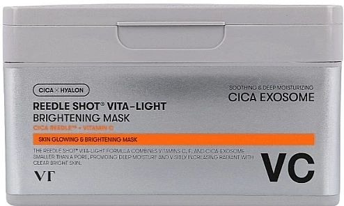 VT Reedle Shot Vita-Light Brightening Mask — komplet posvetljujočih mask s spikuli in vitaminom C korejske blagovne znamke VT Cosmetics. Namenjena je intenzivnemu posvetlitvi pigmentacije, izenačitvi tona kože in zagotavljanju sijočega videza kože.